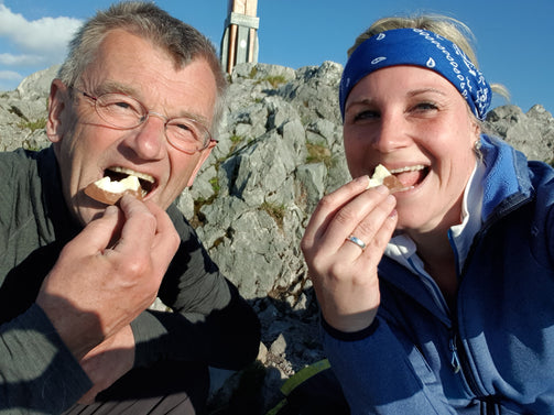 Erfinder und Senior Chef Wolfgang Spiesberger mit Tochter Sophie - hier bei der Gipfelbelohnung. Was isst man auch sonst auf dem Berg? Natürlich eine Watzmann Praline!
