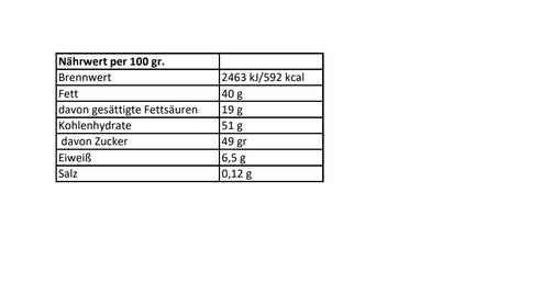 Zutaten: Rohrzucker, Kakaobutter; Vollmilchpulver; Haselnüsse 7,5%; Pflanzliche Fette/Öle (Palmkern; Palm; Kokos); Magermilchpulver; Kakaomasse; Reiscrisp 0,5% (Reismehl, Maisgrieß, Zucker, Speisesalz); Feuchthaltemittel (Sorbitol); Gerstenmalzextrakt; Emulgator (Lecithin, Vanilleextrakt); Mandeln; Sojamehl; Aroma; natürliche Aromen