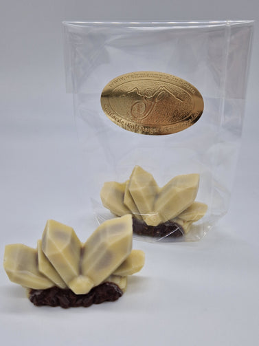 Knuspriger Bergkristall in weißer Schokolade gefüllt mit Haselnussnugat und Knusper