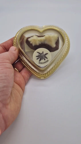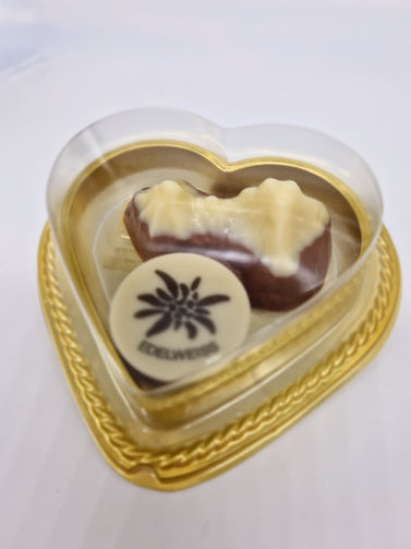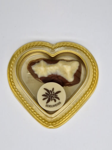 Liebstes kleines Geschenk. Vom Herzerl fürs Herzerl. Ein Vollmilch Watzmann und eine Berchtesgaden Praline/Edelweiß Praline im goldenen Herz.